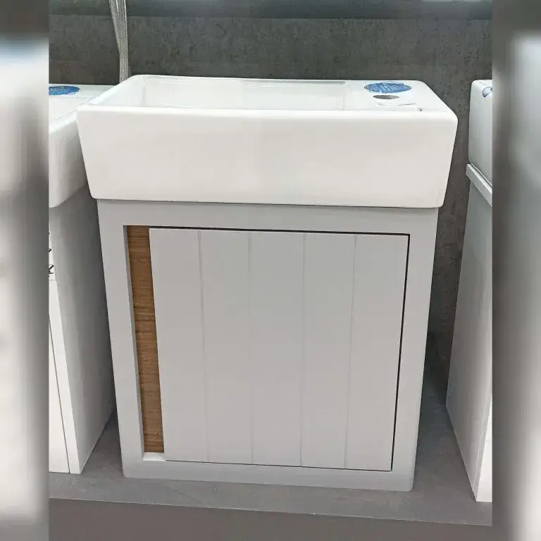 - کابینت پی وی سی روشویی با لبه های ابزار خورده و گرد.